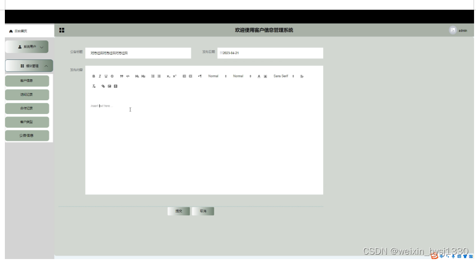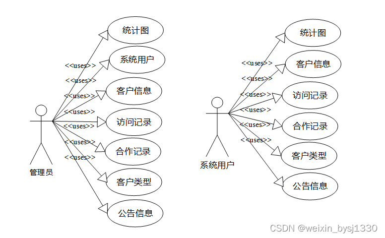 本选题则旨在通过标签分类管理等方式,实现首页,统计图,系统用户(管理员,系统用户),模块管理(客户信息,访问记录,合作记录,客户类型,公告信息)等的功能需求。