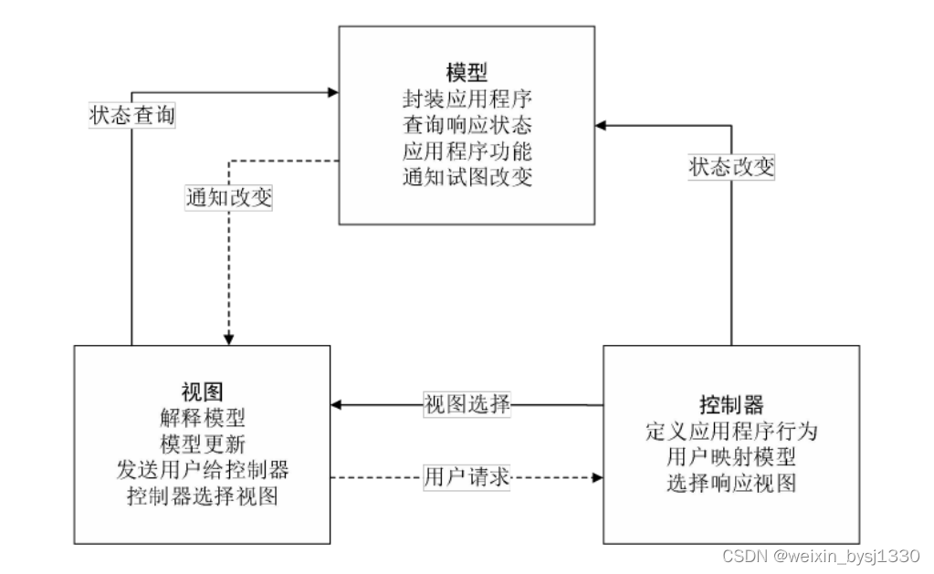 MVVM 就是将其中的View 的状态和行为抽象化,让我们将视图 UI 和业务逻辑分开。当然这些事 ViewModel 已经帮我们做了,它可以取出 Model 的数据同时帮忙处理 View 中由于需要展示内容而涉及的业务逻辑。它强制性的把应用程序的输入、输出和处理全部分开,将其分为三个核心部分,这三个部分分别有不同的功能。
