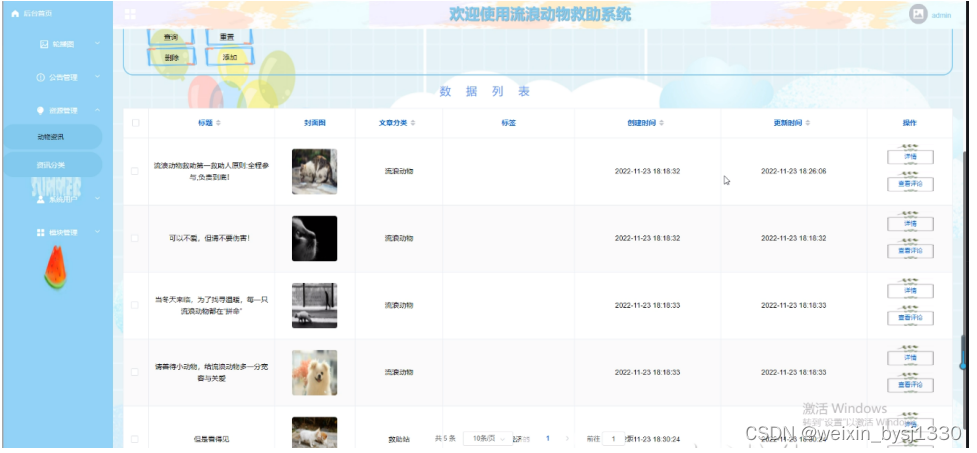 动物资讯,在动物资讯页面中可以查看标题、封面图、文章分类、标签、描述等信息,并可根据详细进行添加或删除等操作,如图5-8所示: