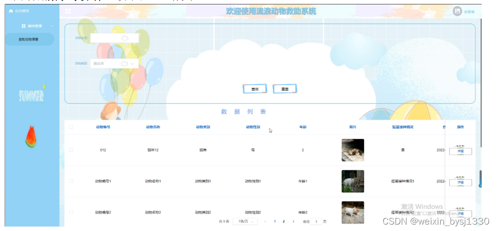 救助动物信息管理,在救助动物信息管理页面中可以查看到动物编号、动物名称、动物类别、动物性别、年龄、照片、疫苗接种情况等信息,并且根据详情进行添加、查询或者删除等操作,如图5-13所示。