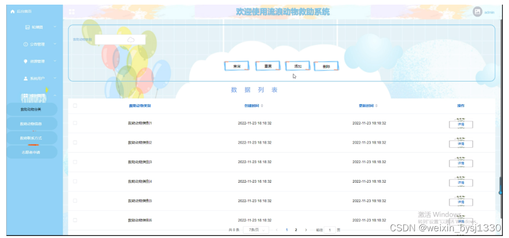 救助动物分类管理,在救助动物分类页面中可以查看救助动物类型等信息,并可根据详细进行添加或删除等操作,如图5-10所示。