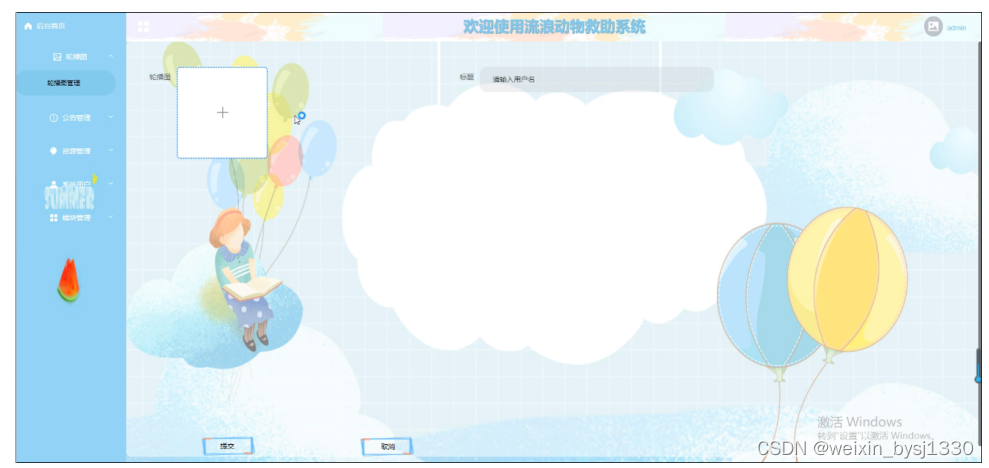 管理员登录进入流浪动物救助系统 可以查看个系统后台首页、轮播图(轮播图管理)、公告管理(公告栏)、资源管理(动物资讯、资讯分类)、系统用户(管理员、注册用户、志愿者)、模块管理(救助动物分类、救助动物信息、救助联系方式、志愿者申请)等信息。如图-5-6所示: