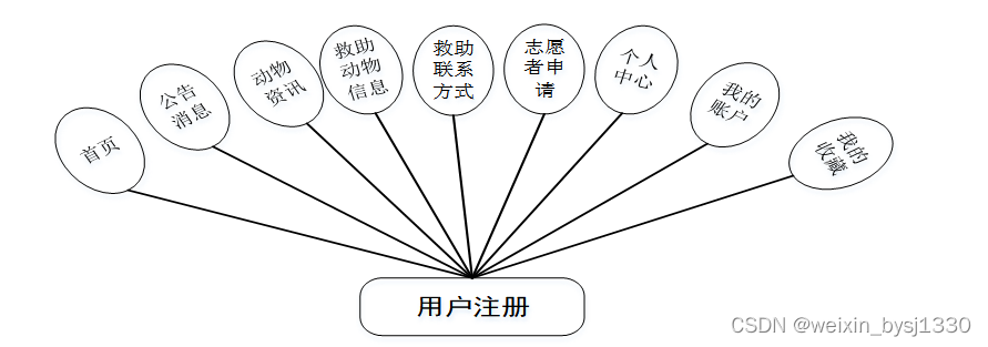 用户进入系统可以首页、公告消息、动物资讯、救助动物信息、救助联系方式、志愿者申请、我的(我的账号、我的收藏、个人中心)等。用户用例如图3-8所示。