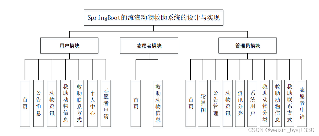 系统架构图属于系统设计阶段,系统架构图只是这个阶段一个产物,系统的总体架构决定了整个系统的模式,是系统的基础。流浪动物救助系统的整体结构设计如图4-2所示。