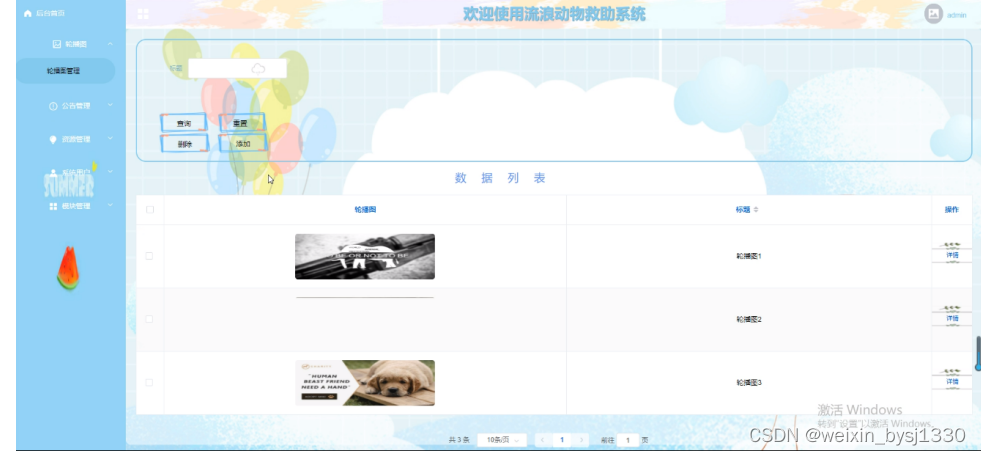 轮播图管理,在轮播图管理页面中可以查看轮播图,标题等信息,并可根据详细进行添加或删除等操作,,如图5-7所示: