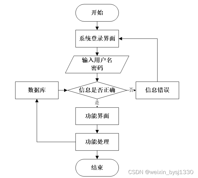 用户打开并进入系统后,会先显示登录界面,输入正确的用户名和密码,系统自动检测信息,若信息无误,则用户会进入系统功能界面,进行操作,否则会提示错误无法登录,操作流程如图3-3所示。