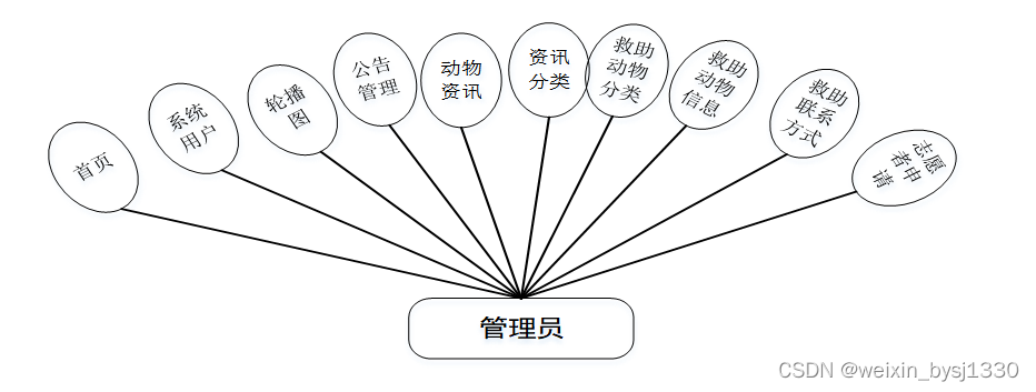 系统中的核心用户是系统管理员,管理员登录后,通过管理员来管理后台系统。主要功能有:首页、轮播图(轮播图管理)、公告管理(公告栏)、资源管理(动物资讯、资讯分类)、系统用户(注册用户、志愿者)、模块管理(救助动物分类、救助动物信息、救助联系方式、志愿者申请)等功能。管理员用例如图3-7所示。