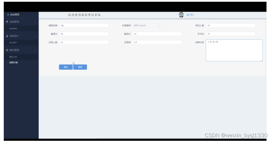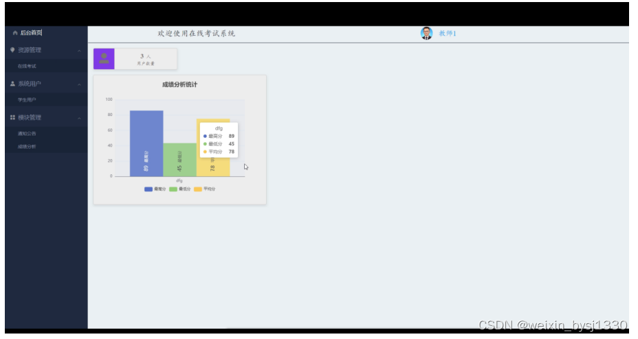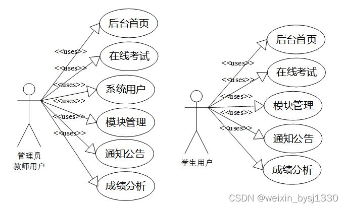 在线考试系统的主要使用者分为管理员,学生用户,教师用户,实现功能包括后台首页,资源管理(在线考试),系统用户(管理员,教师用户,学生用户),模块管理(通知公告,成绩分析)等功能。