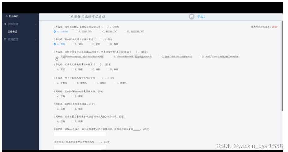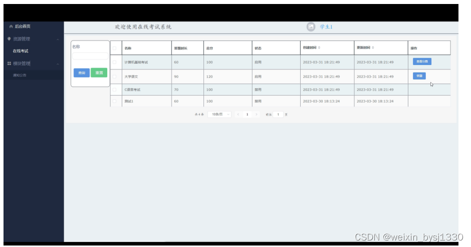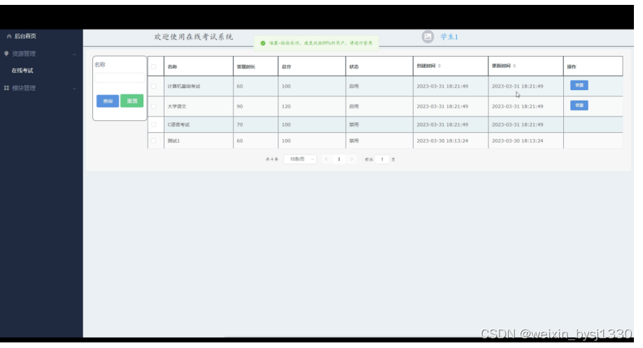 随着计算机互联网技术的迅猛发展,各行各业都已经实现采用计算机相关技术对日益放大的数据进行管理。该课题为设计一个在线考试系统,主要为了方便学生用户线上参加考试,查询成绩,查看考试通知,也方便教师在线设计题库,阅卷改卷,维护成绩,方便管理员对人员进行更加方便快捷的管理,大幅提高考试、阅卷的效率。