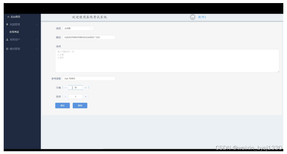 在客观题的上,系统能通过学生提交的答案和参考答案进行数据匹配和对比,完全一致的判定为正确,匹配不成功的判断为错误,在客观题上,只能由教师来进行手动打分,首先提交试卷的主观题,然后展示出来,由教师手动输入,并加入总分。
