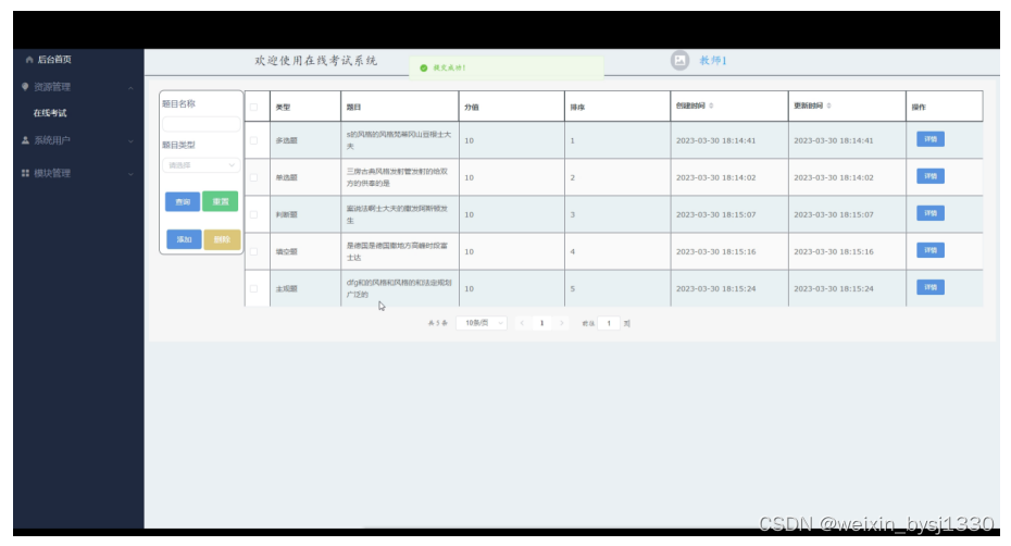题目管理包括单选题管理、判断题管理、多选题管理、主观题管理。教师可以点击“添加题目”超级链接,既可跳转到timuxinxi_add.jsp页添加题目。题目添加成功后,教师可以登录到个人中心查询个人的题目的信息。教师在timuxinxi_list.jsp进行题目管理,timuxinxi_ list.jsp通过查询数据库的题目表列出所有题目管理信息,每条题目对应一个删除按钮和修改按钮,当教师点击删除按钮,直接在数据库删除题目信息,并重定向当前页面,当教师选择点击修改,则进入timuxinxi_update.jsp页面,进行题目信息的修改。