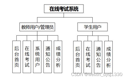 在线考试系统总体分为学生用户模块,教师用户模块和管理员模块。