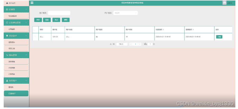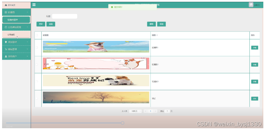 管理员登录进入宠物用品商城可以查看后台首页、公告内容(轮播图、公告栏)系统用户(管理员、普通用户)资讯管理、资讯分类、公告管理、宠物商城管理、订单管理等信息。