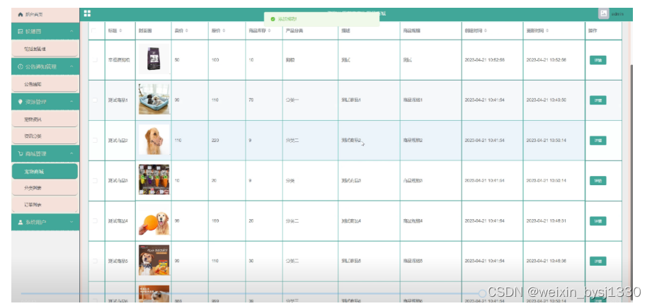 宠物商城管理,在展示页面对宠物商城的商品进行添加,还可对商品进行编辑删除详细等操作 图5-10所示