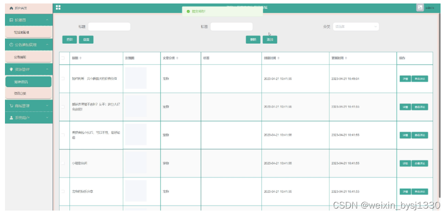 公告通知管理,在公告通知管理页面可以对公告信息进行增删改查等,如图5-6所示。还可以根据需要对宠物资讯进行管理操作,如图5-7所示。