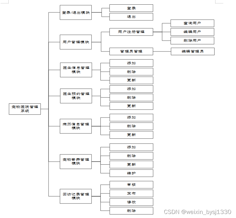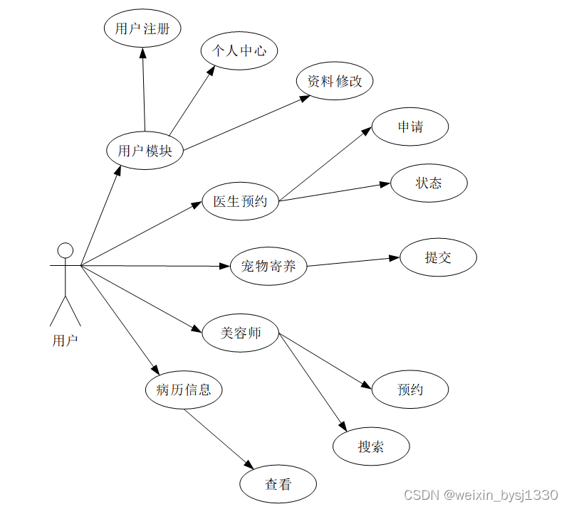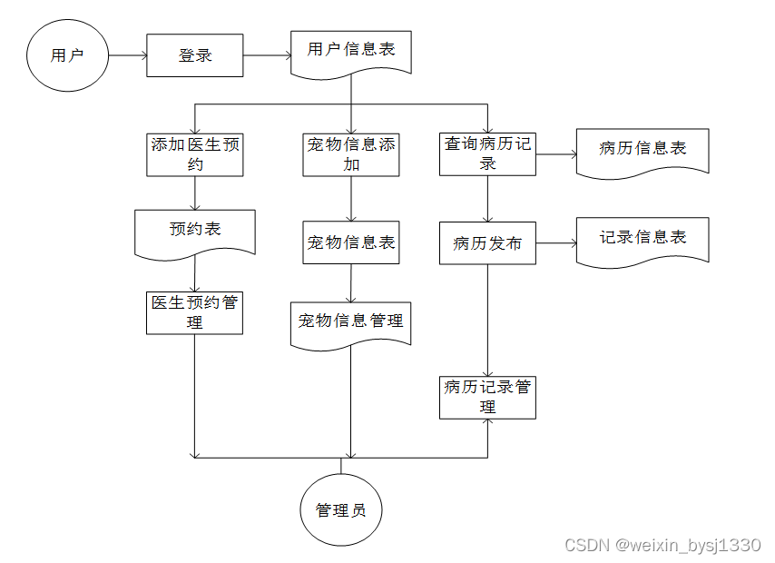 宠物医院管理系统主要是为了更加地完善宠物医疗的服务情况,对用户的信息、从无商品购买、宠物信息和用户管理、病例记录管理、宠物寄养管理、疫苗记录管理、回访记录管理等提供了方便的机制。本系统有多类使用者,分别是管理员和用户、医生登录。以下是从这三种用户的角度分别介绍本系统所要实现的功能。