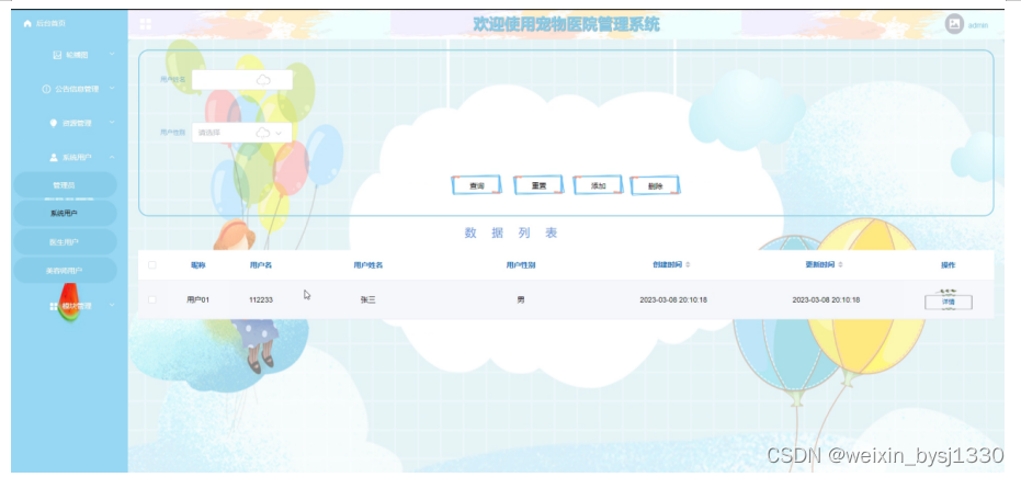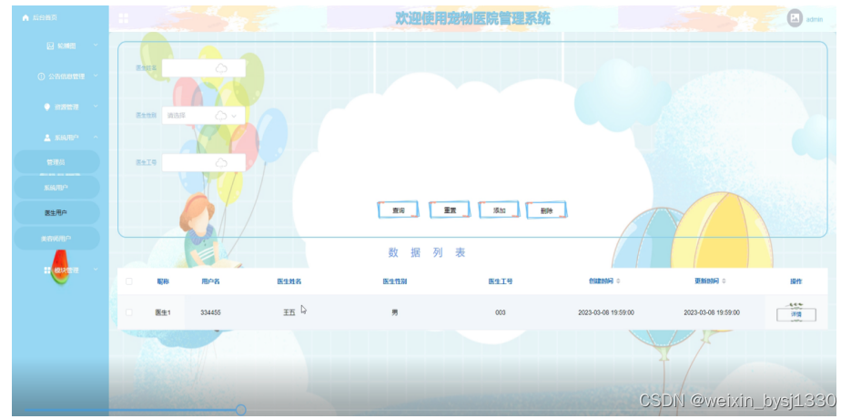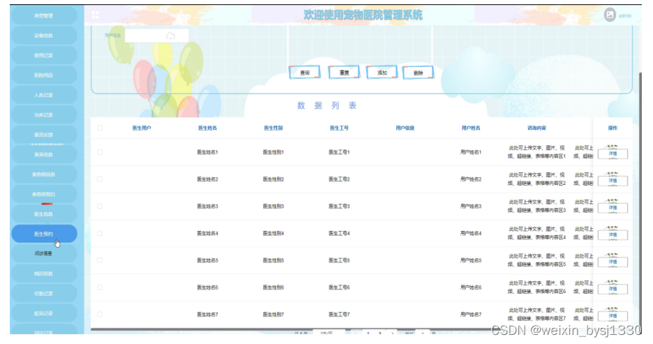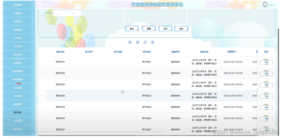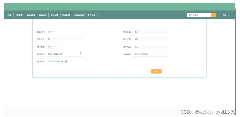 After the demand analysis under the normal office process of the pet hospital, this project has completed the functions of system users, pet products, purchase information, return information, pet foster care, beautician appointment, doctor appointment, consultation information, medical record information, laboratory records, vaccine records, return visit records, etc.