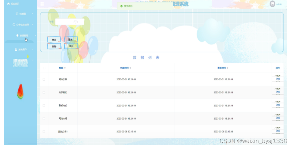 前端部分:前端框架采用了比较流行的渐进式JavaScript框架Vue.js。使用Vue-Router和Vuex实现动态路由和全局状态管理,Ajax实现前后端通信,Element UI组件库使页面快速成型,项目前端通过栅格布局实现响应式,可适应PC端、平板端、手机端等不同屏幕大小尺寸的完美布局展示。