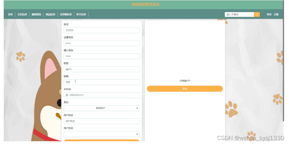 用户管理:对用户进行管理,用户的注册,包括用户昵称、用户名、用户的宠物信息(宠物类别、宠物性别、年龄等)用户的账号信息: