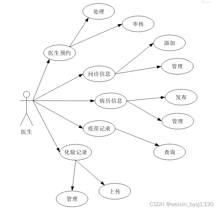3.医生主要负责处理预约、问诊信息、病历信息、疫苗记录、化验记录、回访登记下图所示描述医生的用例图。