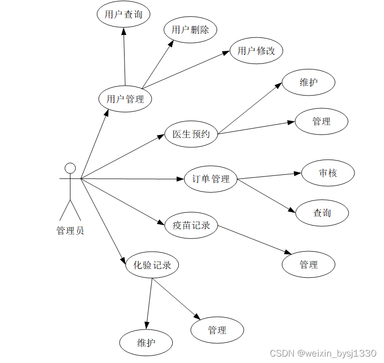 2.管理员主要负责用户管理、医生预约管理、病历信息管理、疫苗记录管理、化验记录管理,下图所示描述管理员的用例图。