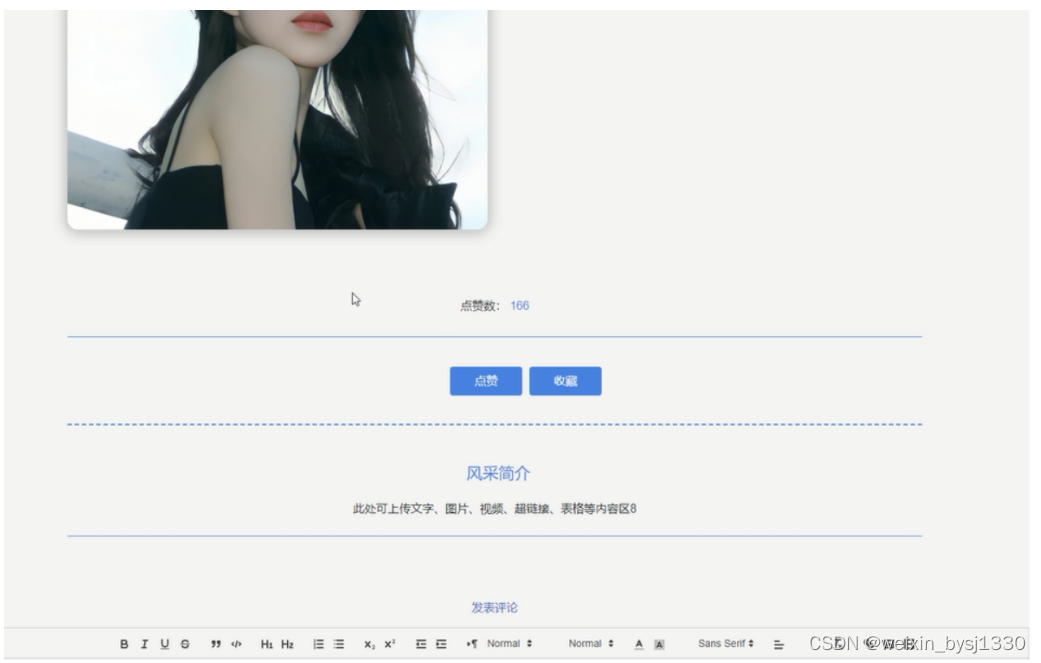 用户点击“用户风采”菜单可以查看所有用户风采信息,可以按照条件查看用户风采,或者输入关键词进行查询,点击可以进入用户风采详细展示界面,在此界面用户可以收藏、点赞和评论。界面如下图4-7所示。