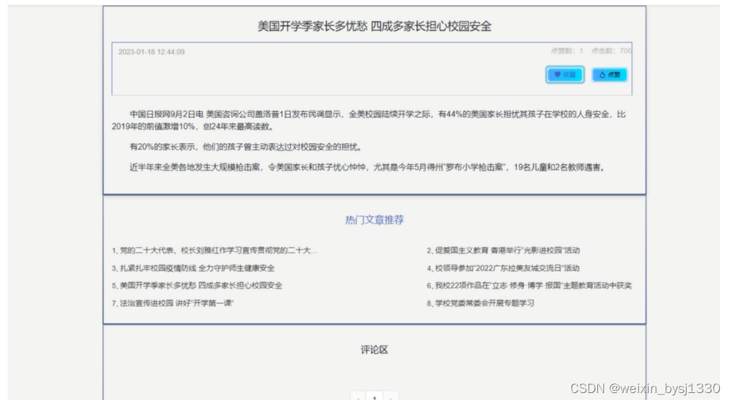 用户点击“校园新闻”菜单显示所有的校园新闻信息,可以按照条件进行校园新闻的筛选或者输入关键词进行局部搜索,点击可以进入校园新闻详细展示界面,在此界面用户可以收藏、点赞和评论。界面如图4-6所示。