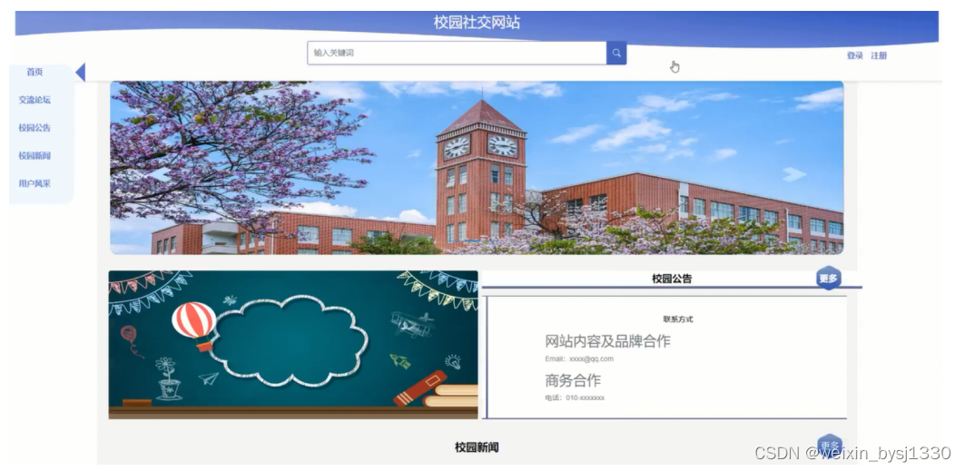 The campus social networking website is mainly developed for campus users to query, communicate and manage campus information. The purpose is to provide a convenient communication environment for campus users, so that campus users can query campus information, publish their own views and communicate whenever and wherever they log in to the system. It solves the disadvantages of traditional point-to-point meeting or email communication and makes the communication more direct, quick and extensive.