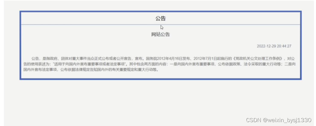 用户点击“校园公告”菜单显示管理员在后台发布的所有的校园公告信息,可以查看校园公告详情。界面如下图4-5所示。