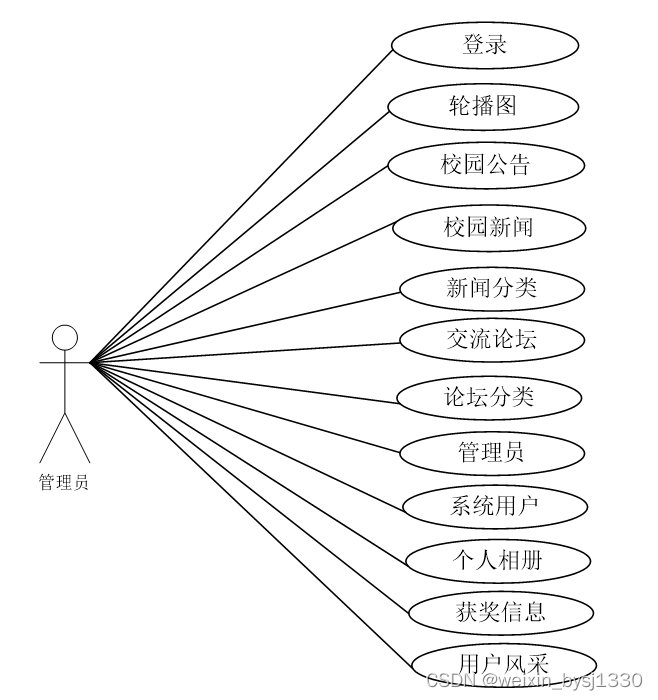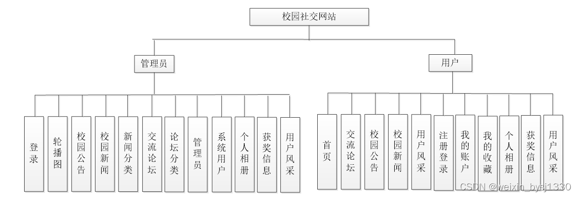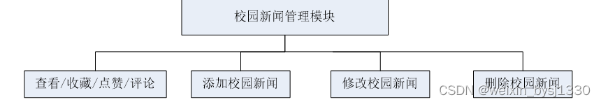 校园社交网站为用户提供了一个校园新闻查询的平台,管理员在后台实现对校园新闻的管理,具体的结构图如下: