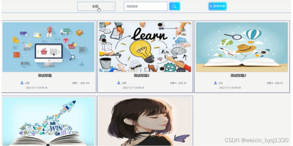 (3)交流论坛:用户点击“交流论坛”菜单显示所有的交流论坛信息,可以按照分类查看帖子信息,或者输入关键词进行局部搜索,点击可以进入帖子的详细展示界面,在此界面用户可以点赞、收藏、评论,也可以点击“发布内容”输入帖子信息进行发帖。