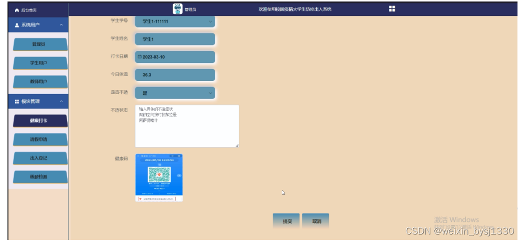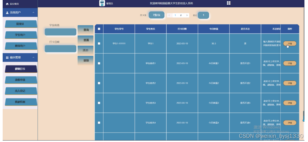 (3)健康打卡:点击“健康打卡”这个按钮可以查看到系统中所有的健康打卡信息,支持通过学生姓名或者学生学号或者打卡日期进行查询健康打卡信息,如果想要添加新的健康打卡信息,点击“添加”按钮然后根据提示输入健康打卡信息,点击“提交”后,在健康打卡界面就会显示新增的健康打卡信息,可以点击某一健康打卡信息查看健康打卡信息的详情,也可以直接点击“删除”进行删除健康打卡;