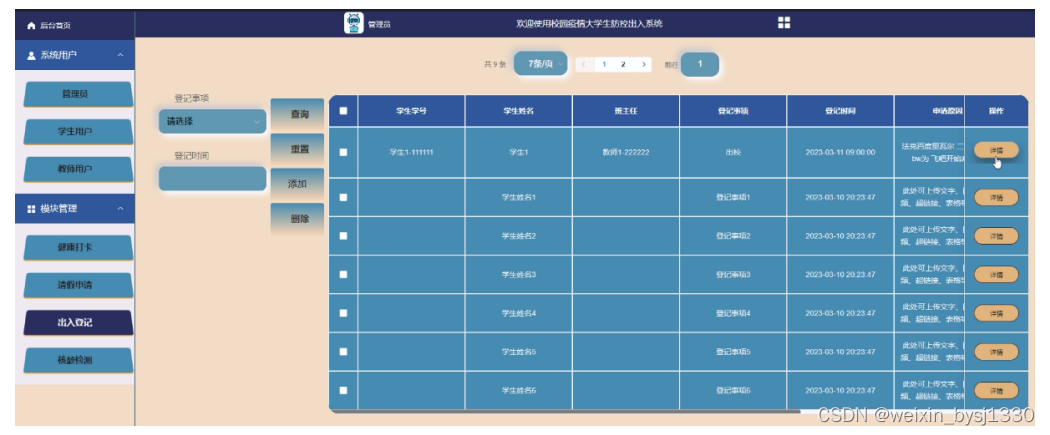(5)出入登记:点击“出入登记”这个菜单,可以查看到系统中所有添加的出入登记信息,支持通过学生学号或者学生姓名对出入登记信息进行查询,如果想要了解某一出入登记的详细信息,点击后面的“详情”会进入详情界面;