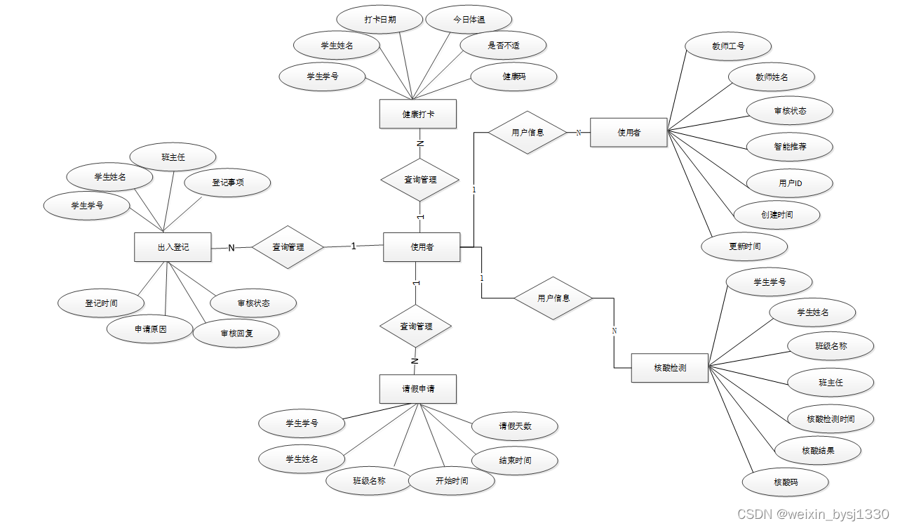 下面是整个校园疫情大学生防控出入系统中主要的数据库表总E-R实体关系图。
