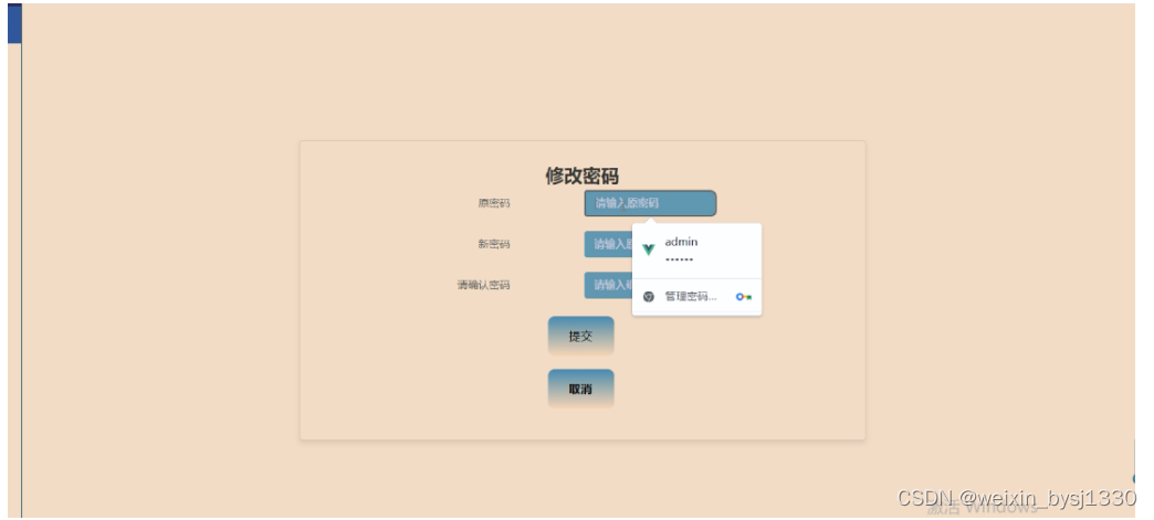 用户使用该校园疫情大学生防控出入系统注册完成后,用户对登录密码有修改需求时,系统也可以提供用户修改密码权限。系统中所有的操作者能够变更自己的密码信息,执行该功能首先必须要登入系统,然后选择密码变更选项以后在给定的文本框中填写初始密码和新密码来完成修改密码的操作。在填写的时候,假如两次密码填写存在差异,那么此次密码变更操作失败,下面的图片展示的就是该板块对应的工作面。