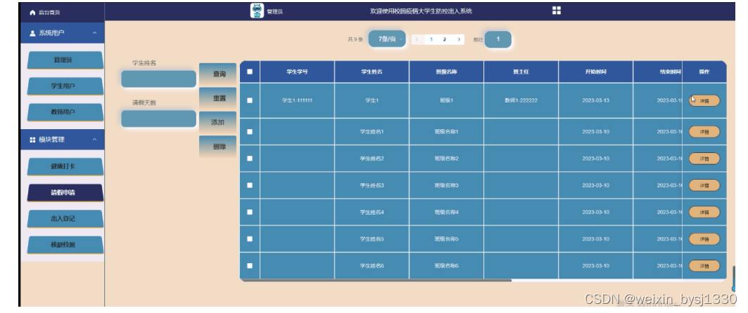 (5)请假申请:点击“请假申请”这个按钮可以查看到所有请假申请信息,支持通过学生姓名或者学生学号或者开始时间进行查询请假信息,可以对请假申请信息进行添加、删除、查看请假信息的详细内容;