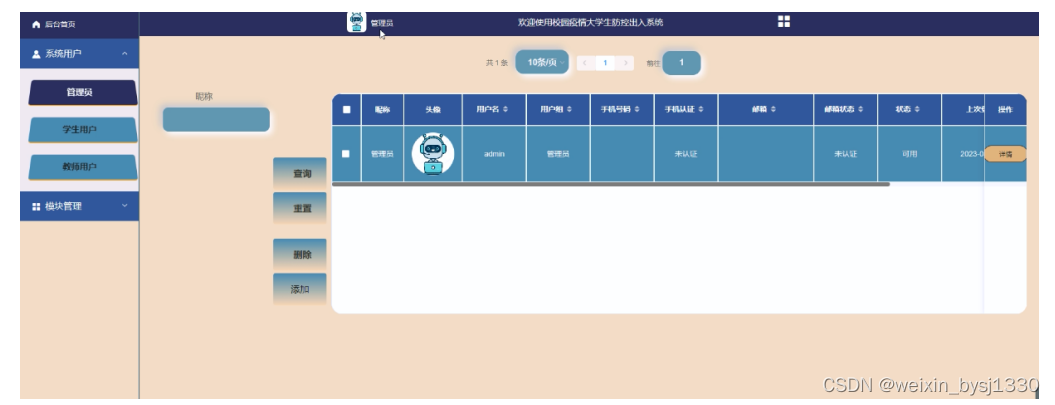 (2)用户管理:管理员可以对系统中所有的用户角色进行管控,包含了管理员、学生以及教师这三种角色,如果需要添加新的用户,点击页面中的“添加”按钮根据提示输入上用户信息,点击“提交”以后在对应的用户界面就可以查看到了,可以点击用户后面的“删除”按钮直接删除某一用户。