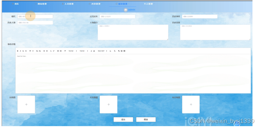 5.2.5管理员对历史长河管理进行添加朝代、公元纪年、历史事件、历史人物、人物简介、历史背景、事件详情、封面图、关系图谱、时空地图等内容进行添加、删除、修改以及查看评论等操作。程序效果图如下图5-6所示: