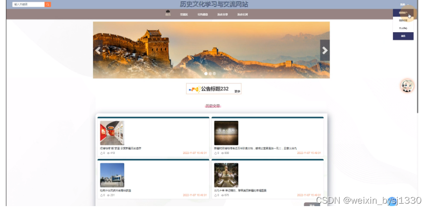互联网的产生,带来了网络的再次高速发展,人们的生活得到了翻天覆地的变化。人们可以随时随地的享受互联网带来的方便快捷,在生活工作中的方方面面的需要都能在网络上实现,比如首页、网站管理(轮播图、公告栏)、人员管理(管理员、普通用户)、内容管理(交流区、交流分类、历史文章、文章分类)、模块管理(历史长河)、个人管理(个人信息、修改密码)等等进行查看。也就是说网络成了人们目前最直接、最方便、最轻松的接入口。