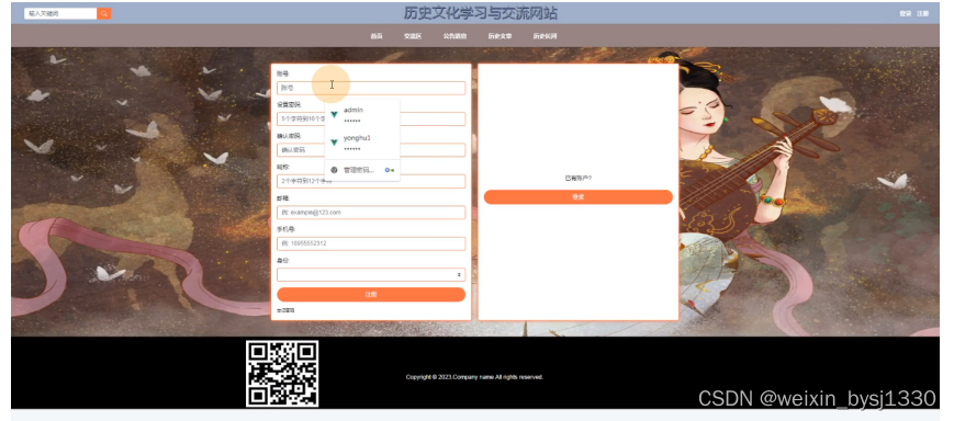 通过填写账号、设置密码、确认密码、昵称、邮箱、手机号、身份、用户编号、用户姓名等信息进行注册,输入完成后选择注册、登陆即可进入历史文化学习与交流网站,如图5-7所示。