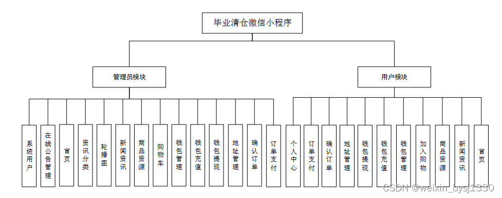 本毕业清仓微信小程序主要包括三大功能模块,即清仓功能模块、管理员功能模块和用户模块。