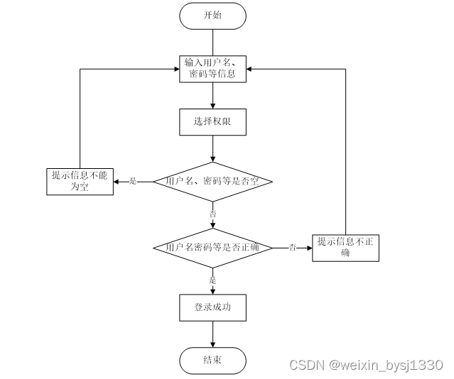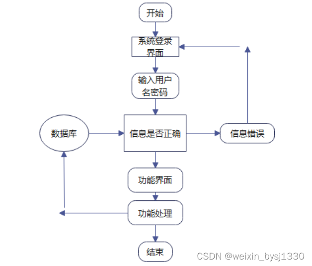 用户打开并进入系统后,会先显示登录界面,输入正确的用户名和密码,系统自动检测信息,若信息无误,则用户会进入系统功能界面,进行操作,否则会提示错误无法登录,操作流程如图3-3所示。