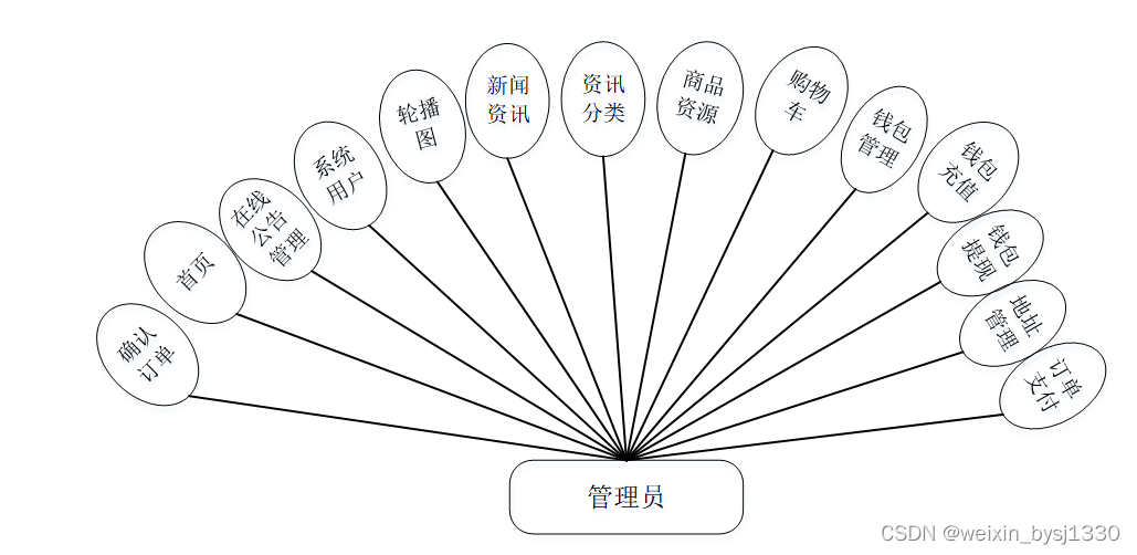 (1)管理员模块:系统中的核心用户是系统管理员,管理员登录后,通过管理员菜单来管理后台系统。主要功能有:首页、在线公告管理(在线公告)、系统用户(管理员、学生用户)、轮播图(轮播图管理)、资源管路(新闻资讯、资讯分类)、模块管理(商品资源、购物车、钱包管理、钱包充值、钱包提现、地址管理、确认订单、订单支付)等。管理员用例图如图3-1所示。