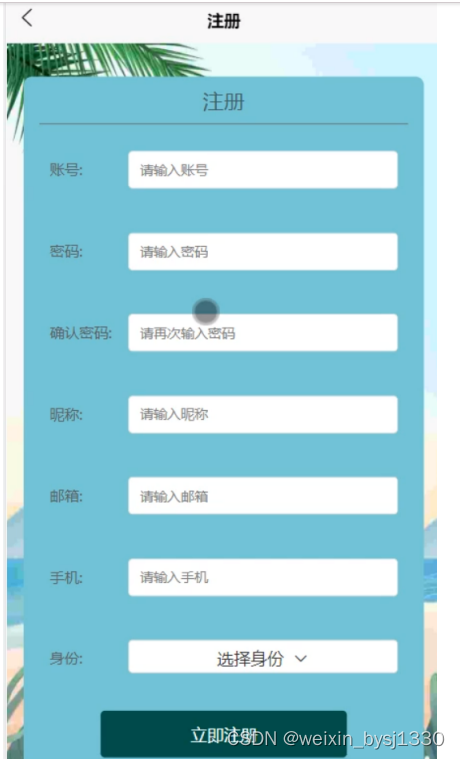 用户注册,在用户注册页面通过填写账户、密码、确认密码、昵称、邮箱、手机、身份、学生姓名、所在校区、联系电话、详细地址、微信号码、学生学号等信息完成用户注册,如图5-2所示。用户在登录页面通过填写用户名、密码、等信息进入系统,如图5-3所示。