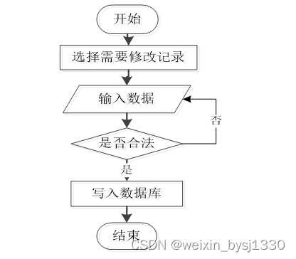 管理员可以对清仓信息等进行的修改,用户和清仓也可以对自己权限内的信息进行修改,首先进入修改信息界面,输入修改信息数据,系统进行数据的判断验证,修改信息合法则修改成功,信息更新至数据库,信息不合法则修改失败,重新输入。修改信息流程图如图3-5所示。