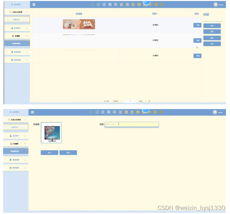 轮播图管理,在轮播图管理页面中可以添加通知信息:轮播图、标题等信息,还可在轮播图管理页面对轮播图信息进行添加、删除或详细等操作,如图5-8所示。