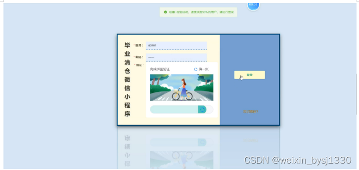 管理员登录,通过填写注册时输入的账号、密码、滑动滑块进行验证码进行登录,如图5-6所示。