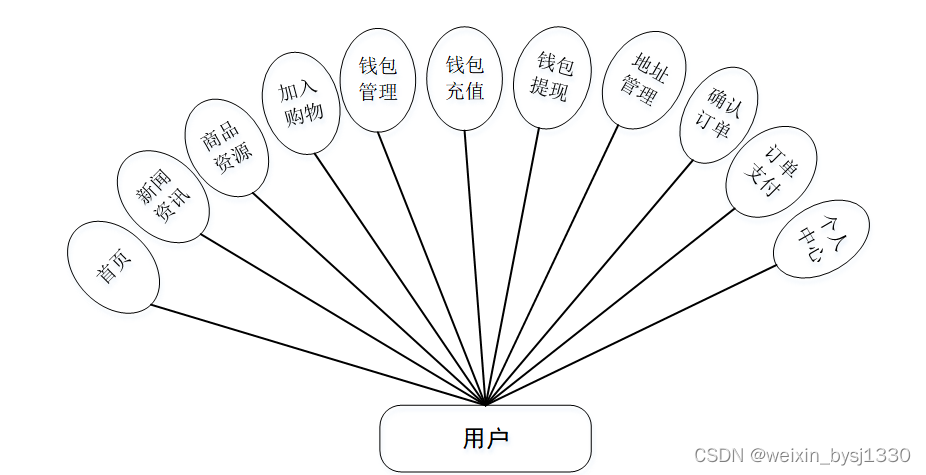 (2)用户,主要功能有:首页、新闻资讯、我的(商品资源、加入购物、钱包管理、钱包充值、钱包提现、地址管理、确认订单、订单支付、个人中心)管理等,如图3-2所示。