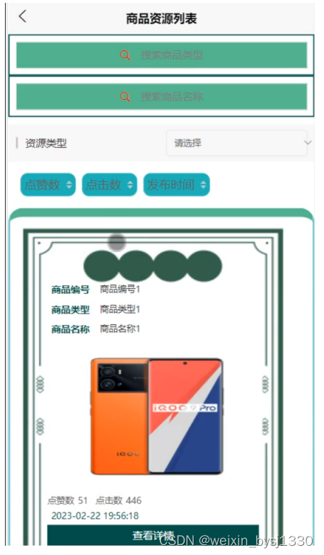 商品资源列表页面,在商品资源列表页面可以查看商品编号、商品类型、商品名称、商品价格、新旧程度、资源类型、商品图片、卖家图像等信息,可以进行点赞、收藏、评论加入够买车等功能操作,如图5-4所示。