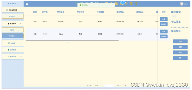 用户管理,在用户注册管理页面中可以对账户、密码、确认密码、昵称、邮箱、手机、身份、学生姓名、所在校区、联系电话、详细地址、微信号码、学生学号等信息进行添加、删除或详细等操作,如图5-9所示。
